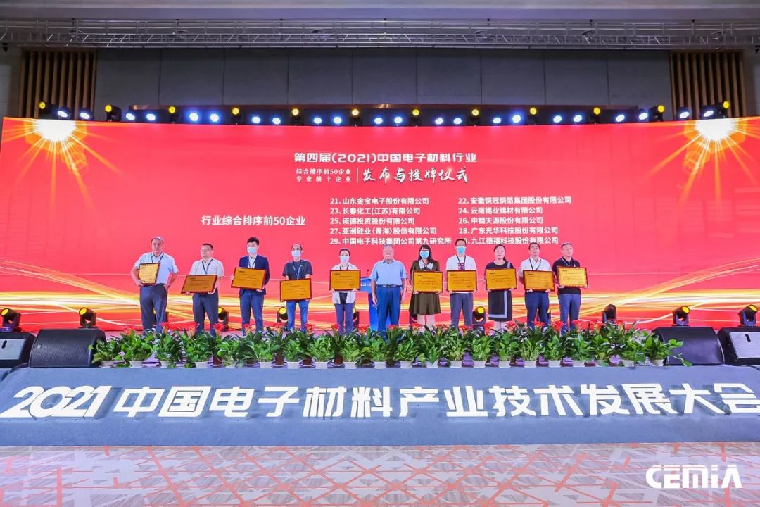 大会期间进行了第四届(2021年)中国电子材料行业综合排序前50企业及半导体材料等八个专业前十企业榜单发布与授牌仪式。
