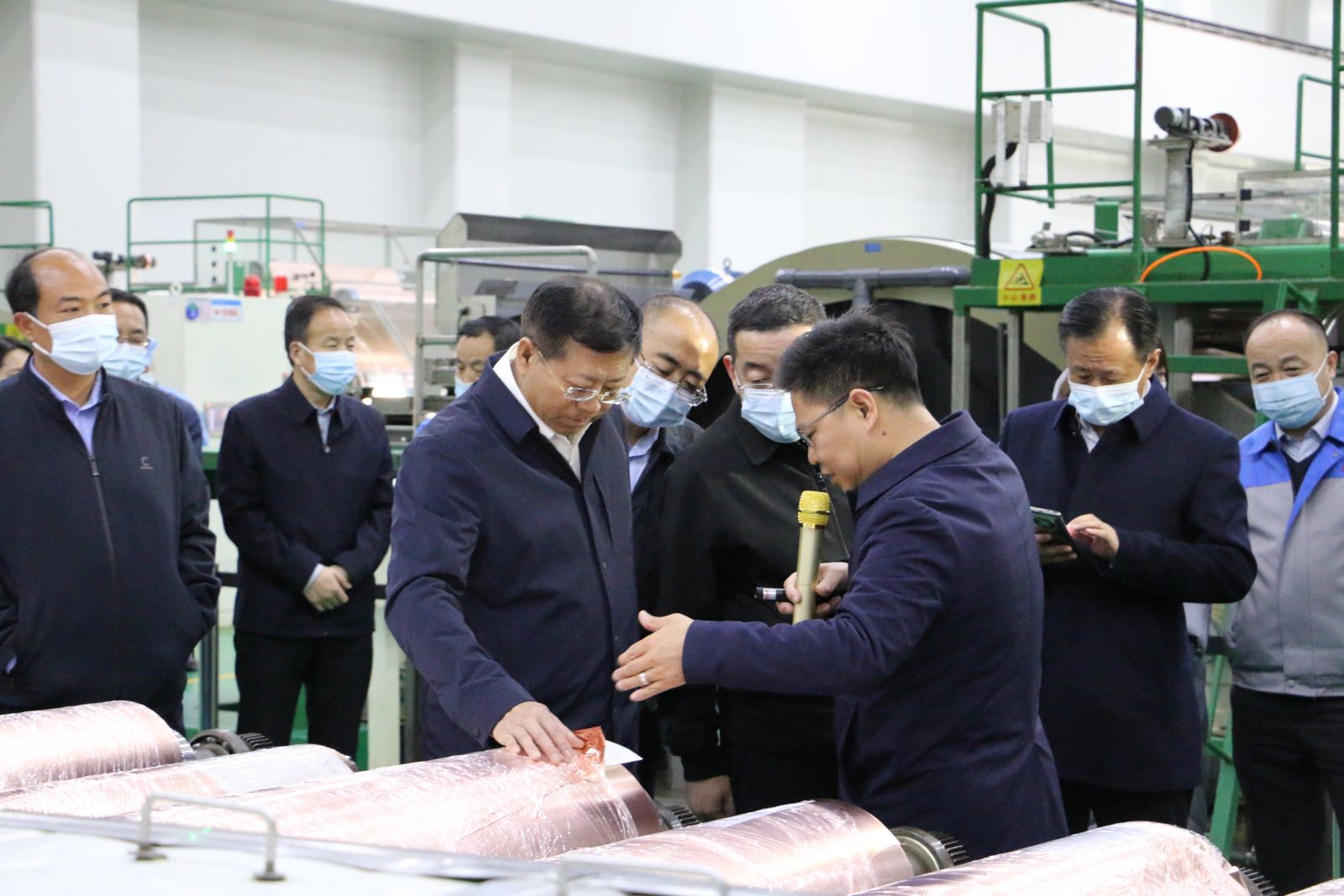 在公司制一部车间和制二部车间,周启伦为王黎明副省长一行详细介绍了铜箔生产工艺流程和生产设备,此外并就公司的生产经营情况及设备升级改造情况进行了汇报,周启伦表示,“公司设备升级改造已完成,相较以往,产量和利润都会一定程度的提升。”